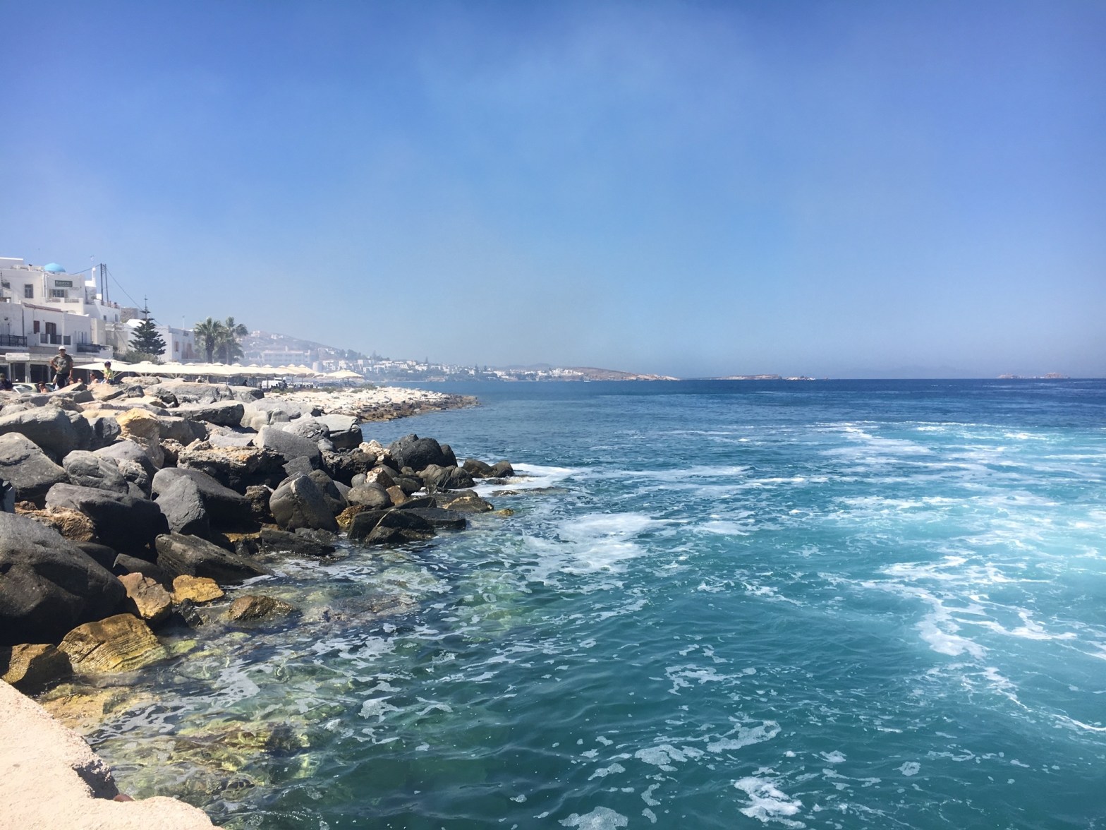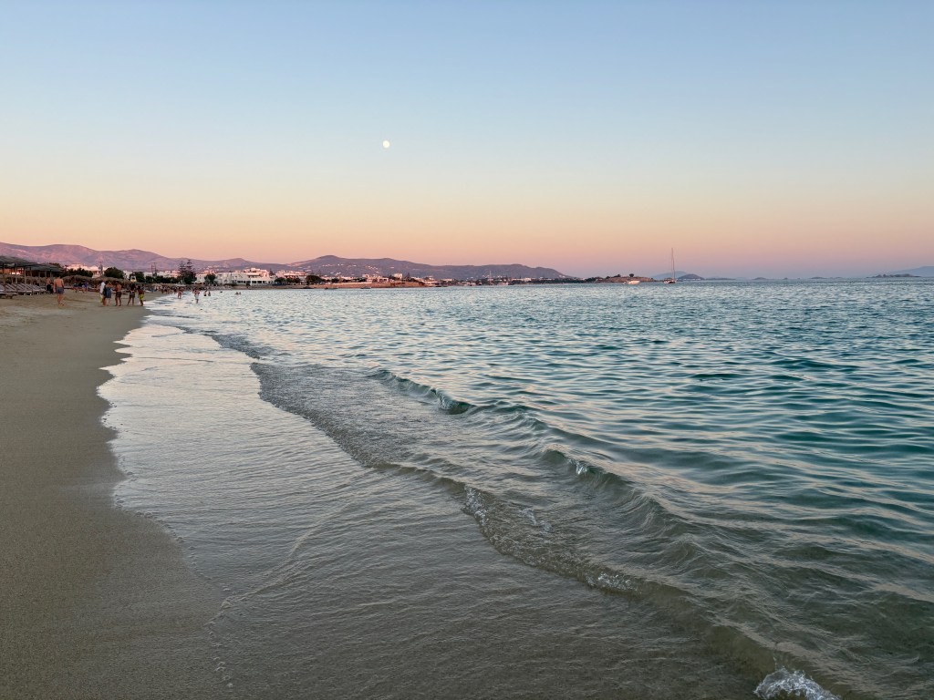 We spent the least time at Agios Prokopios, but we appreciated its natural beauty and the fact that the north end of the beach is undeveloped. We ate our fill with our feet in the sand at O Barbounis, where we found our favorite french fries and horiatiki of the trip—because yes, we had french fries and horiatiki at every single restaurant we visited. The fish was deliciously fresh and the moussaka was also the best I’d had in years.