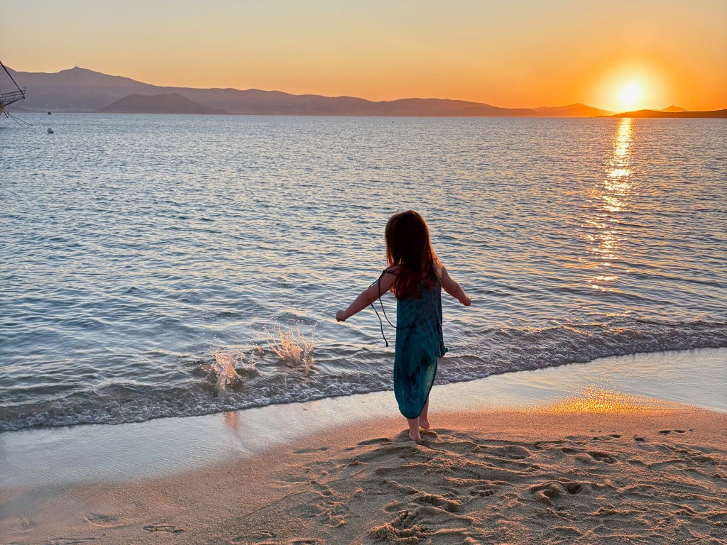 We also enjoyed Agia Anna, Agios Prokopios, and Maragkas Beach. Each beach is full of restaurants and bars with chaise lounge service and tables in the sand, a priceless convenience for when our girl didn’t want to stop building a sandcastle at meal time (which was every time). All of them offer a beautiful view of the sunset, but the slight westward curve by the small port at Agia Anna boasts a more direct angle if you’re seeking dramatic portraits by the sea. Hold down a spot at Island Bar around 7:30 and you should have space to take your photos before the crowds gather… by 8:00 pm, it gets more competitive. We had dinner at Palatia Beach restaurant just a few doors down, where we drank Aperol spritz ate mezze style while our kid ferried back and forth from the shoreline to our table between bites. I recommend the smelt!