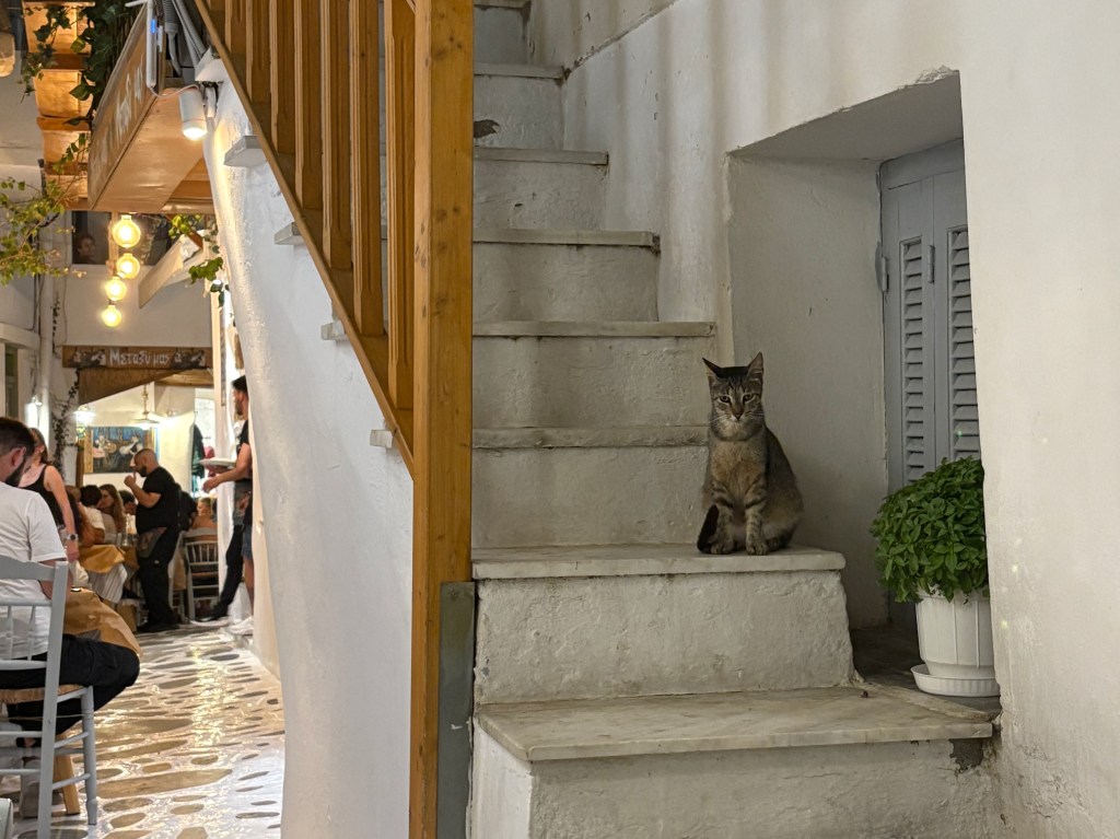 Dining options were not as reliable here, in my opinion, but we had decent Italian food at Hug Me Naxos and gyros at Yasouvlaki. Our favorite option in town was another recommendation from Spyros, Metaxi Mas. It’s nestled in one of those labyrinthine alleyways that island villages are known for, complete with boughs of bougainvillea and a pack of well-fed cats. We especially loved their fried eggplant and tzatziki, but be prepared for some serious garlic breath if you order the latter.