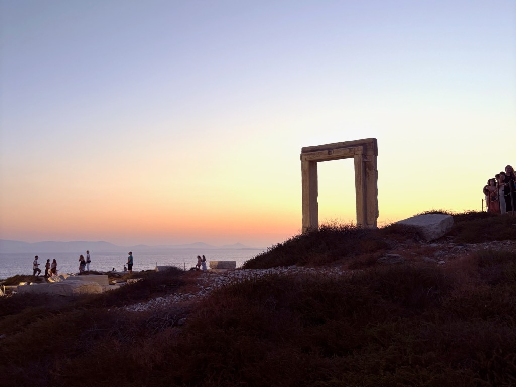 The “Great Door” at the Temple of Apollo is one of the most famous and prominent ruins of Naxos. It juts out on its own little peninsula at the northern tip of Chora, so it greeted us at port before we could even see the rest of the island. We had a nice little hike from the center of town, down along the waterfront, across the land bridge and up the hill to watch the sun set at the shrine to the Sun God. I recommend starting your ascent a little earlier than we did, more like 7:15 pm, but we still managed to spend 20 or so minutes in awe of another gorgeous light show above the Aegean. It was one of the busiest spots we visited on the whole trip, but there was a communal feeling of reverence watching the sun go down in the west and the full moon come up above town in the east. We even got to see a couple get engaged! I recommend bringing cash for the buskers (mostly teen musicians with impressive talent) and shoes with good ankle support if you’re prone to rolling yours (like me).